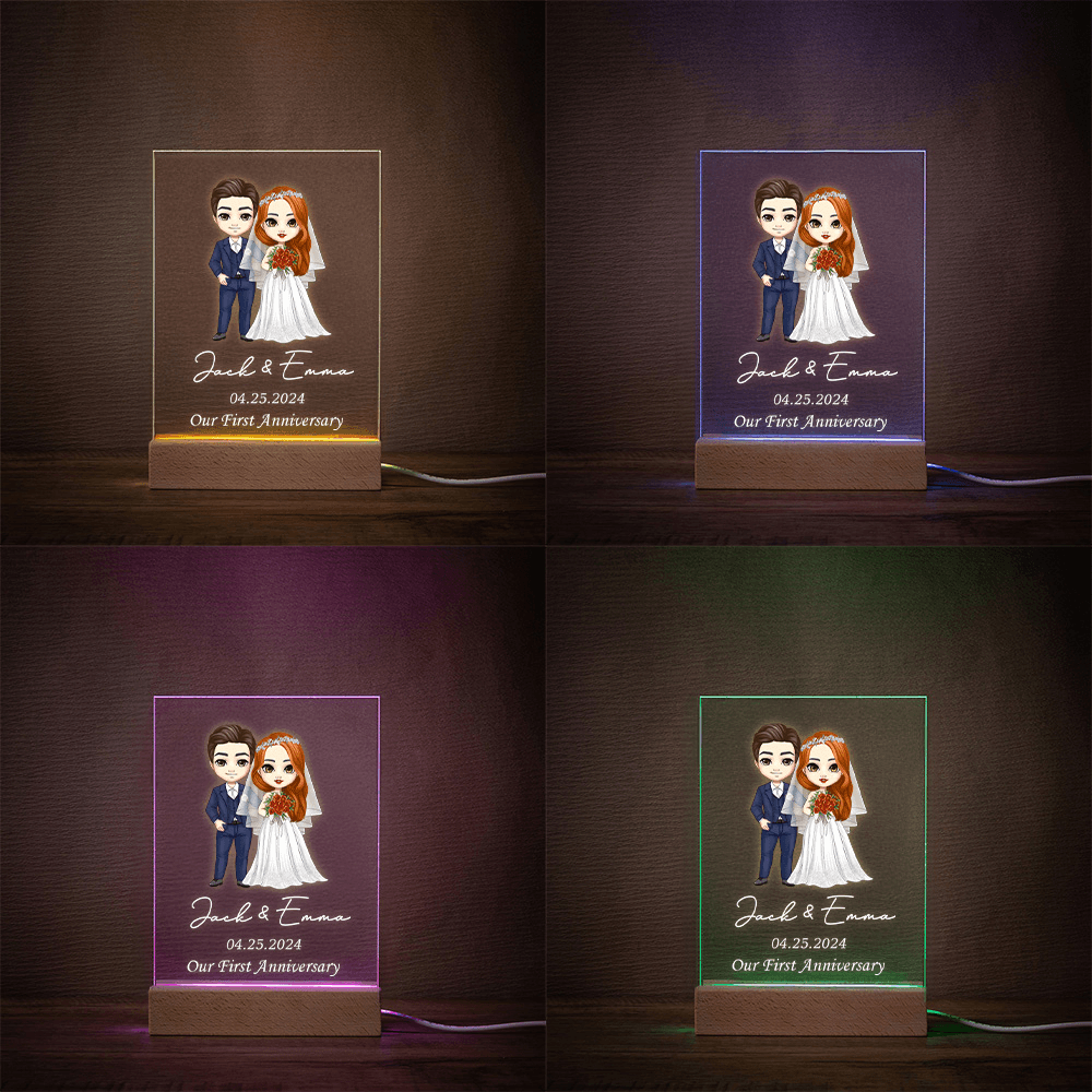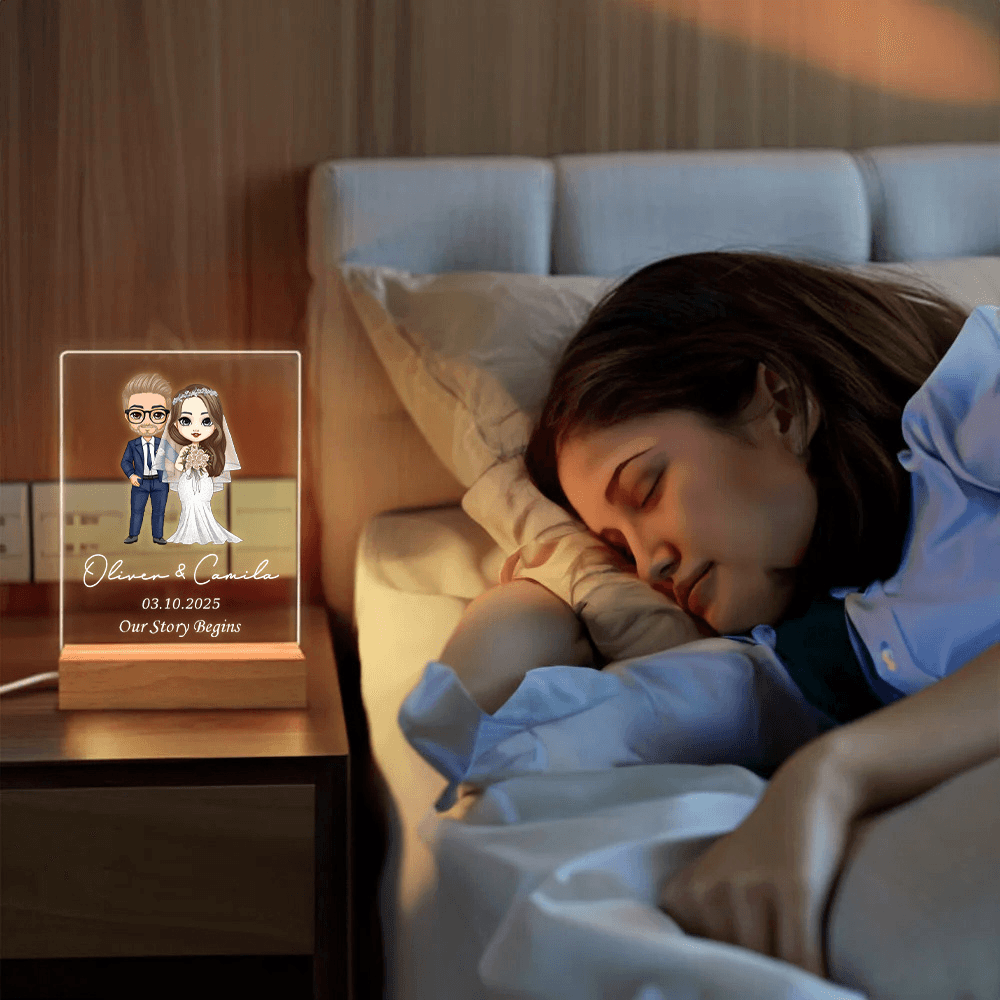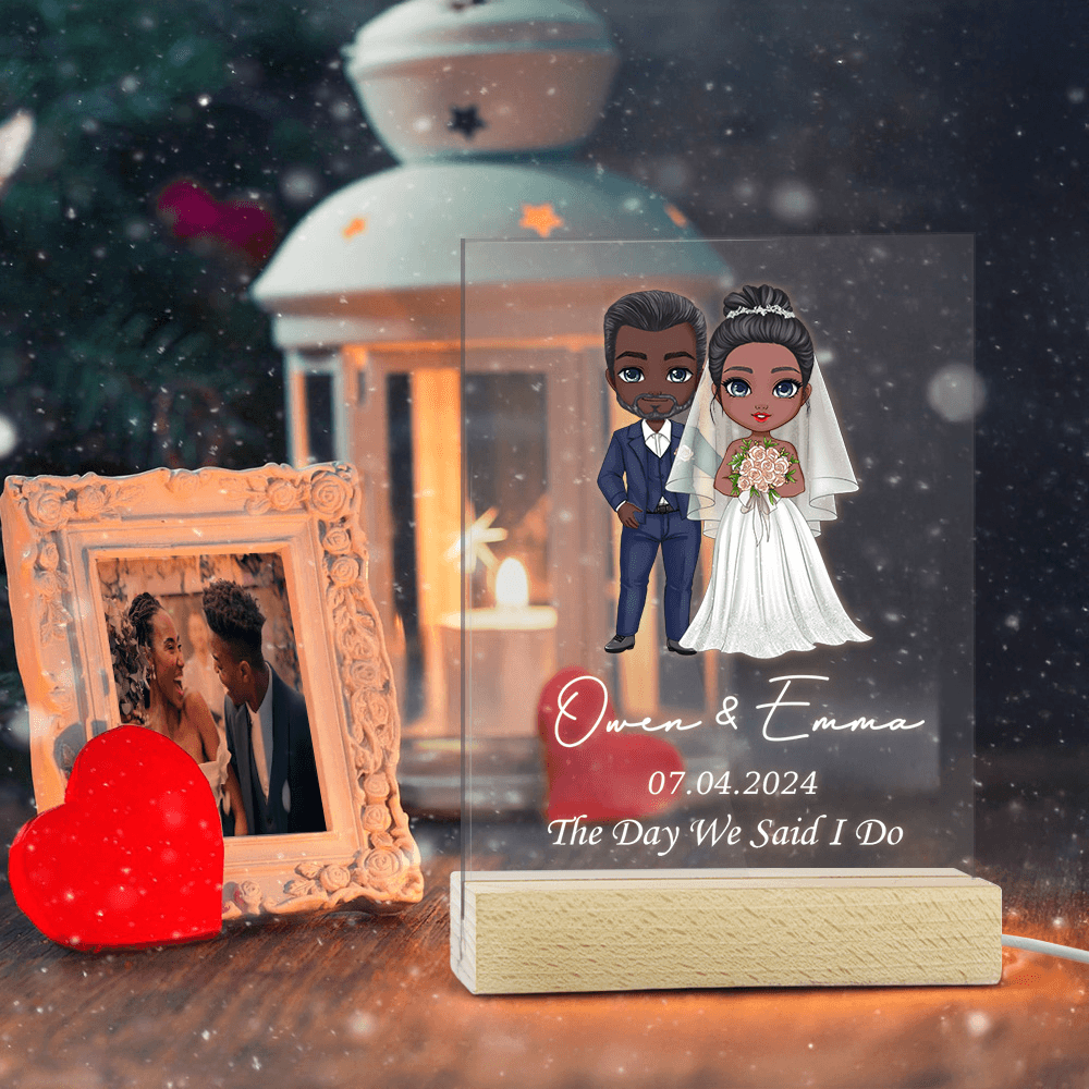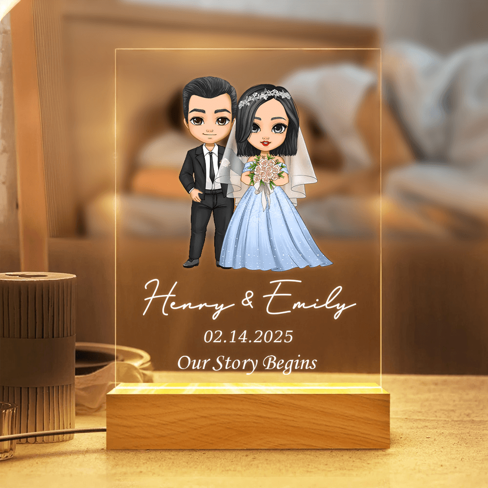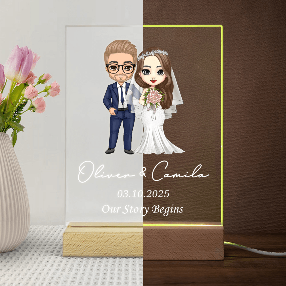 Personalized Design - Customize this romantic night light with the couple’s names and wedding date, along with a charming cartoon illustration of a bride and groom, creating a one-of-a-kind keepsake for any couple.