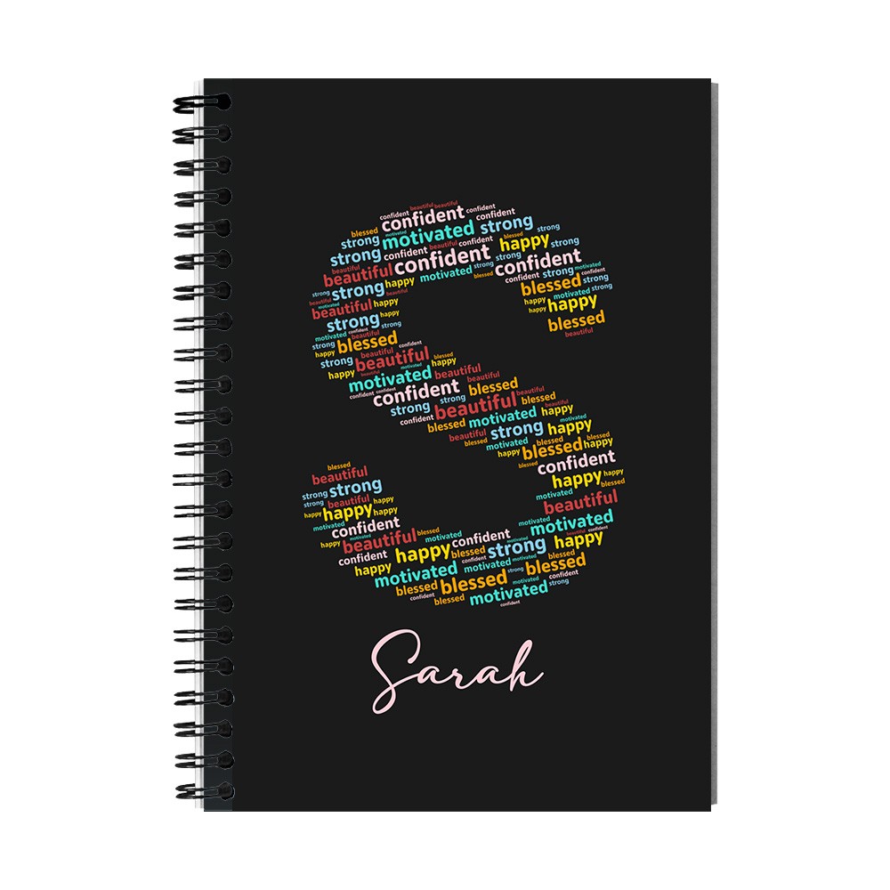 Custom Notebook with Positive Affirmation Word Cloud Design - This custom spiral notebook uses a positive word cloud design, which gathers positive words into the initials of your name to help personal growth and motivation.