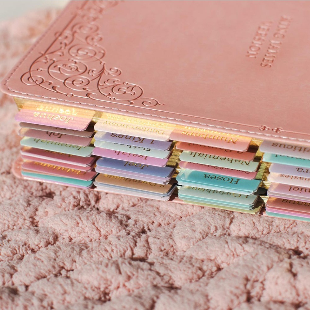 A soft blush pink cover is accented with a heat debossed frame that is embellished with intricate scrollwork. The gold foiled title and heat debossed version reference is displayed within the frame.