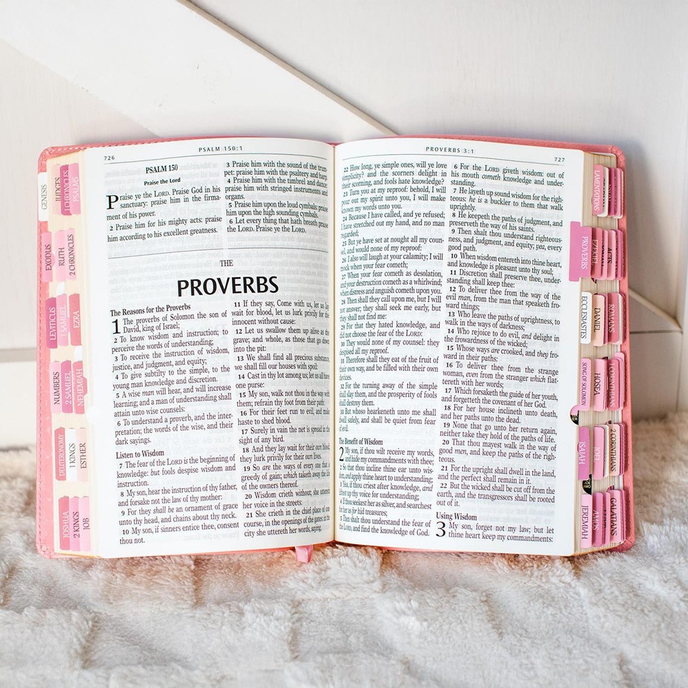 The flexcover opens completely flat without damaging the spine. A soft pink satin ribbon marker and thumb-indexing tabs offer an easy way to navigate and mark your Bible. The easy-to-read 14-point type allows you to read your Bible without eye strain and allows you to read the Giant Print Bible from a fair distance—no need to hold it up close. Essential study resources include double-column formatting, a thematic Scripture verse finder, concordance, topical verse finder, the words of Christ that are printed in red ink and a one-year Bible reading plan.
