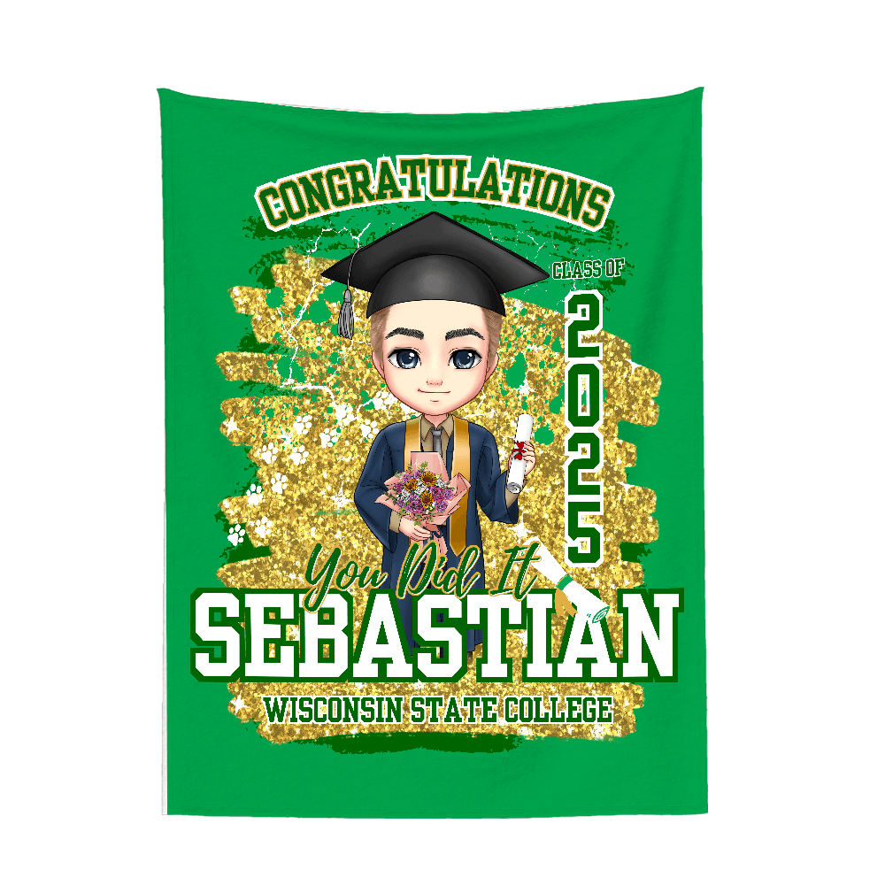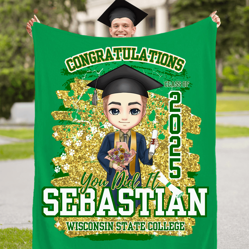 Personalized Name & Cartoon Character Graduation Congratulations Blanket, Class of 2025 Graduation Memorial Blanket, Graduation Gift for Boys/Girls
