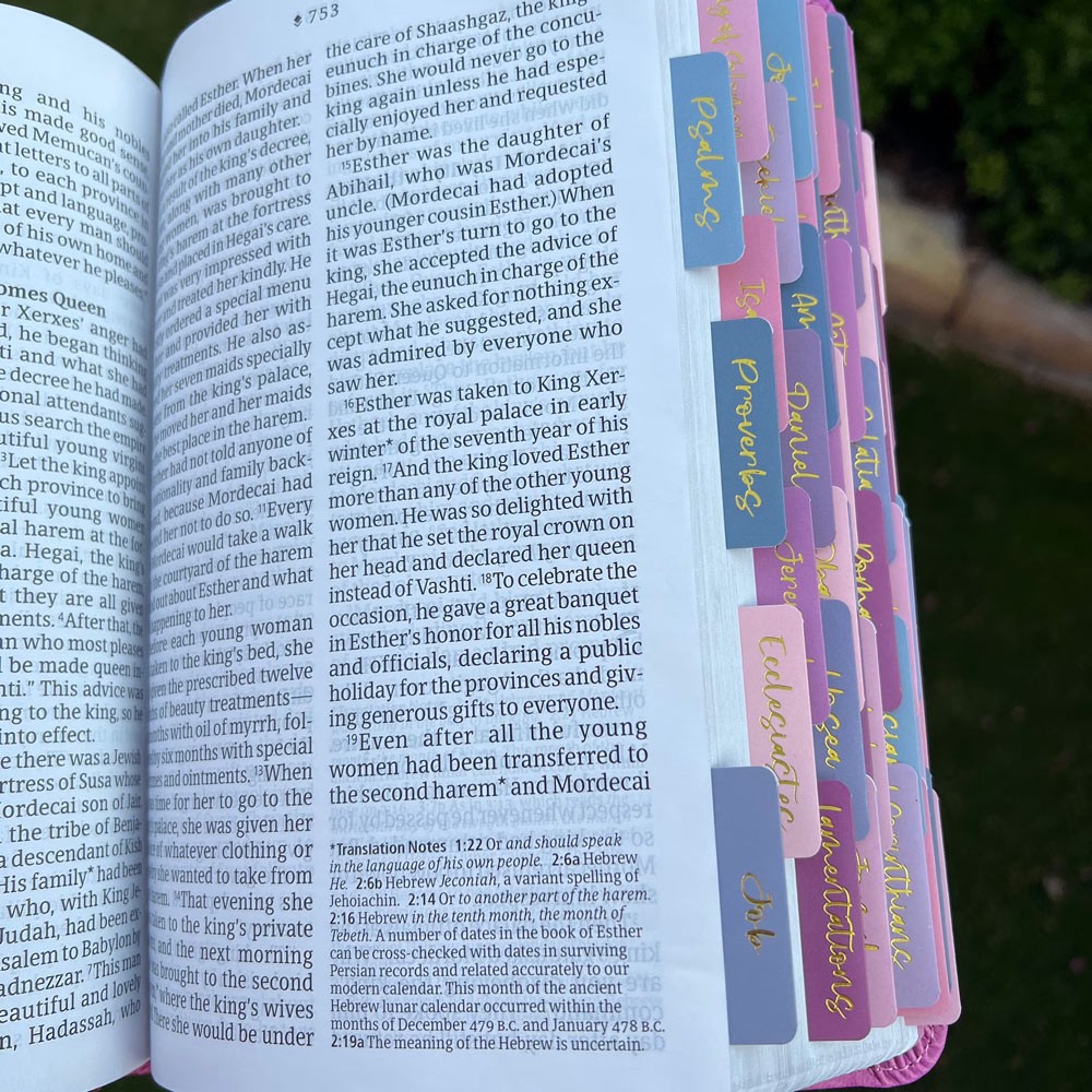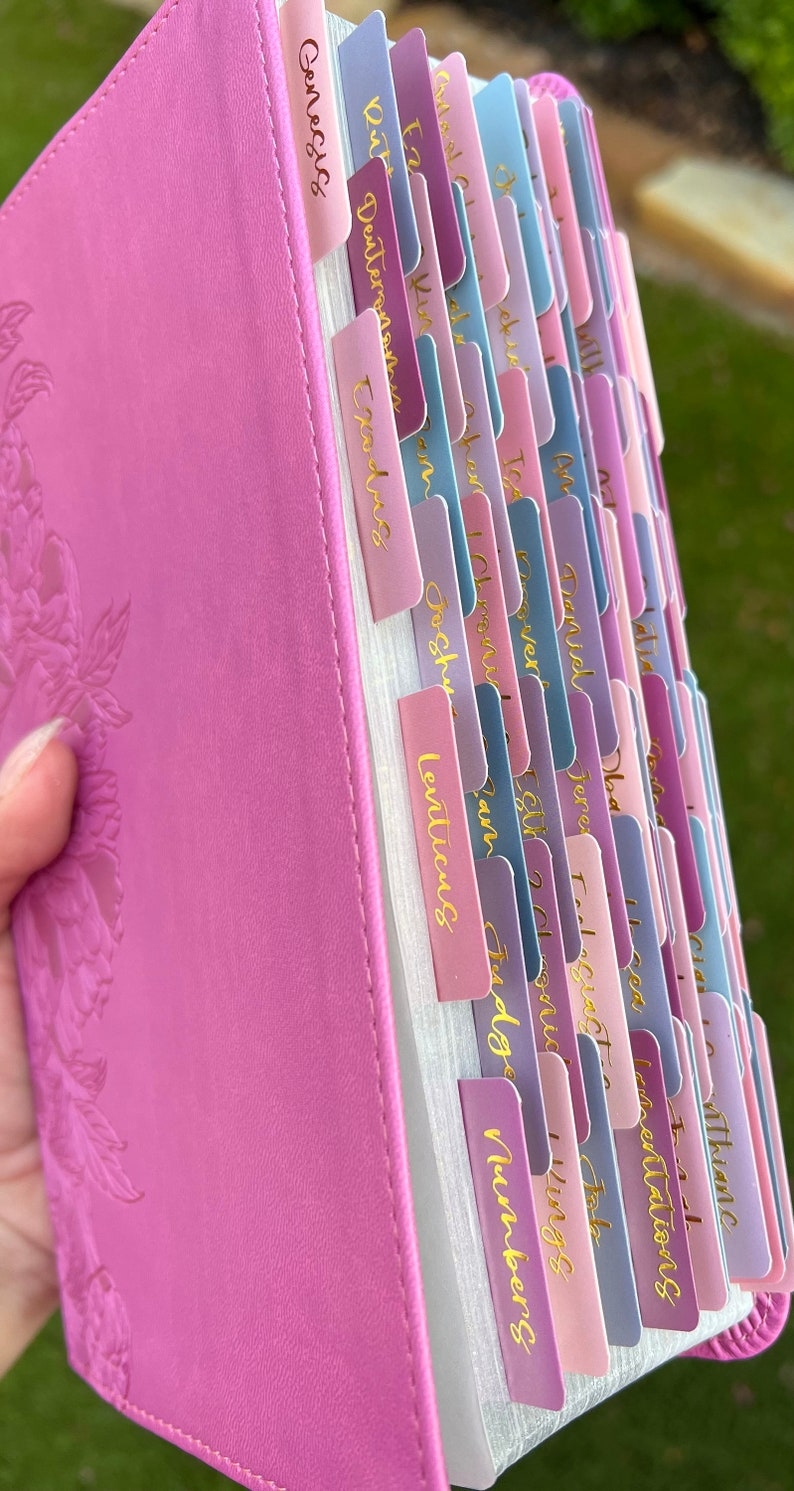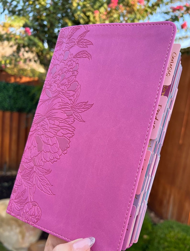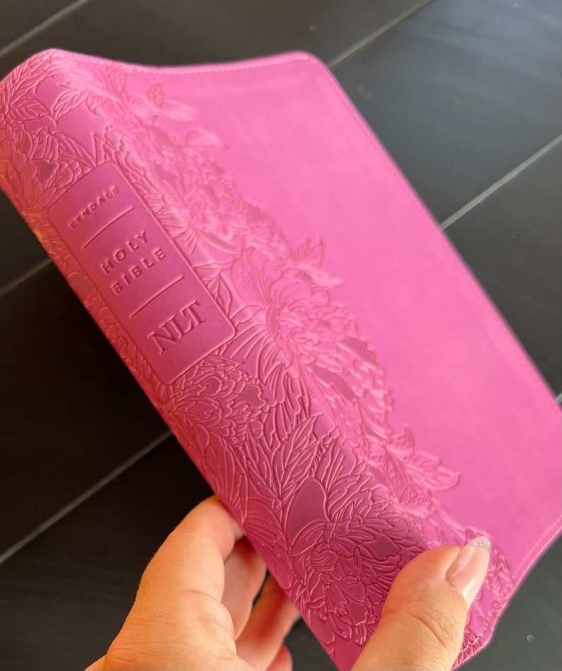 The Pink NLT Giant Print Holy Bible 🌸 blends elegance, readability, and practicality in a portable size (9"x6"x1.75"). Its soft leather touch cover is paired with handmade ombre tabs in gold lettering ✨ for quick navigation and a truly personalized touch.